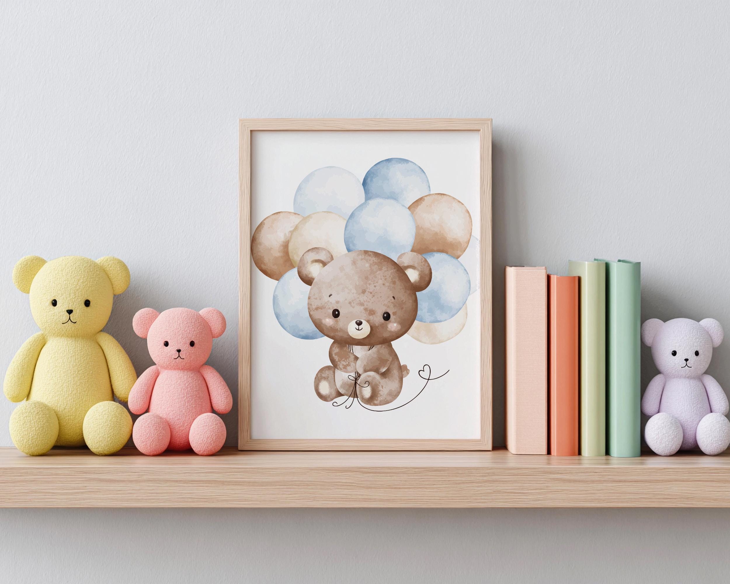 Watercolour Teddy Bear Print | Nursery Wall Art with Blue Balloons | Digital Download