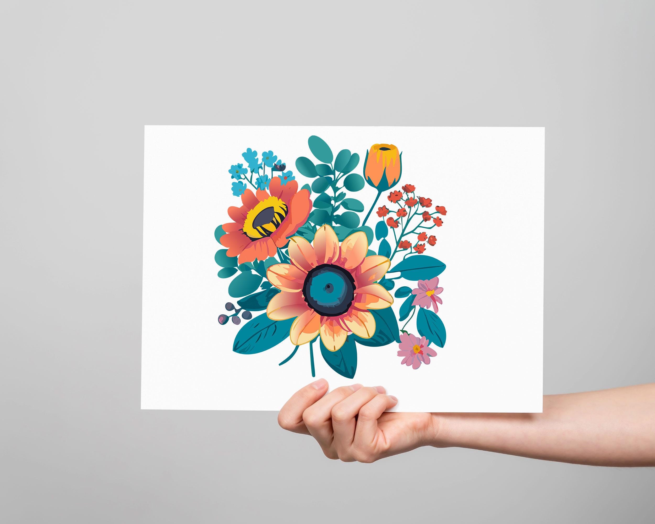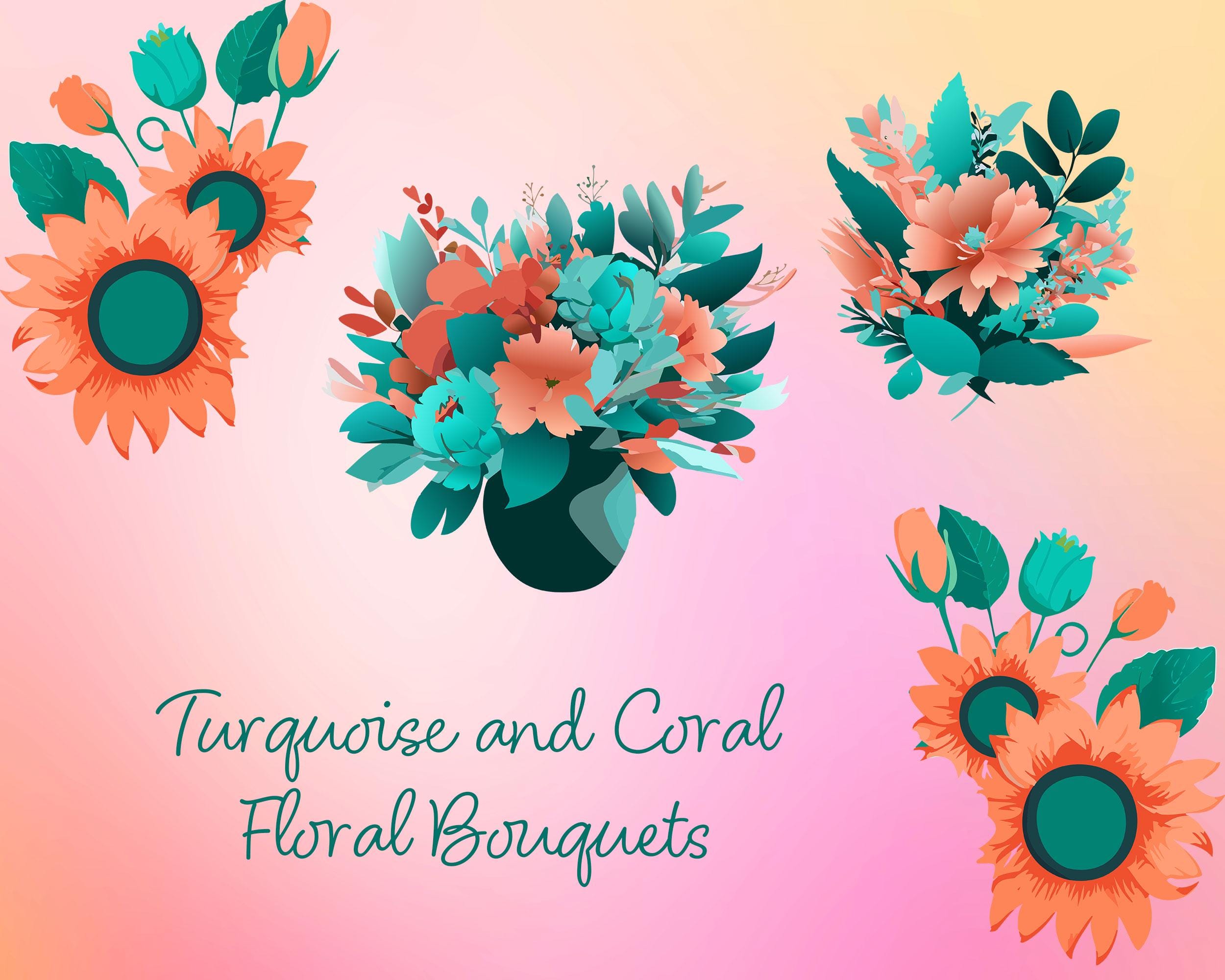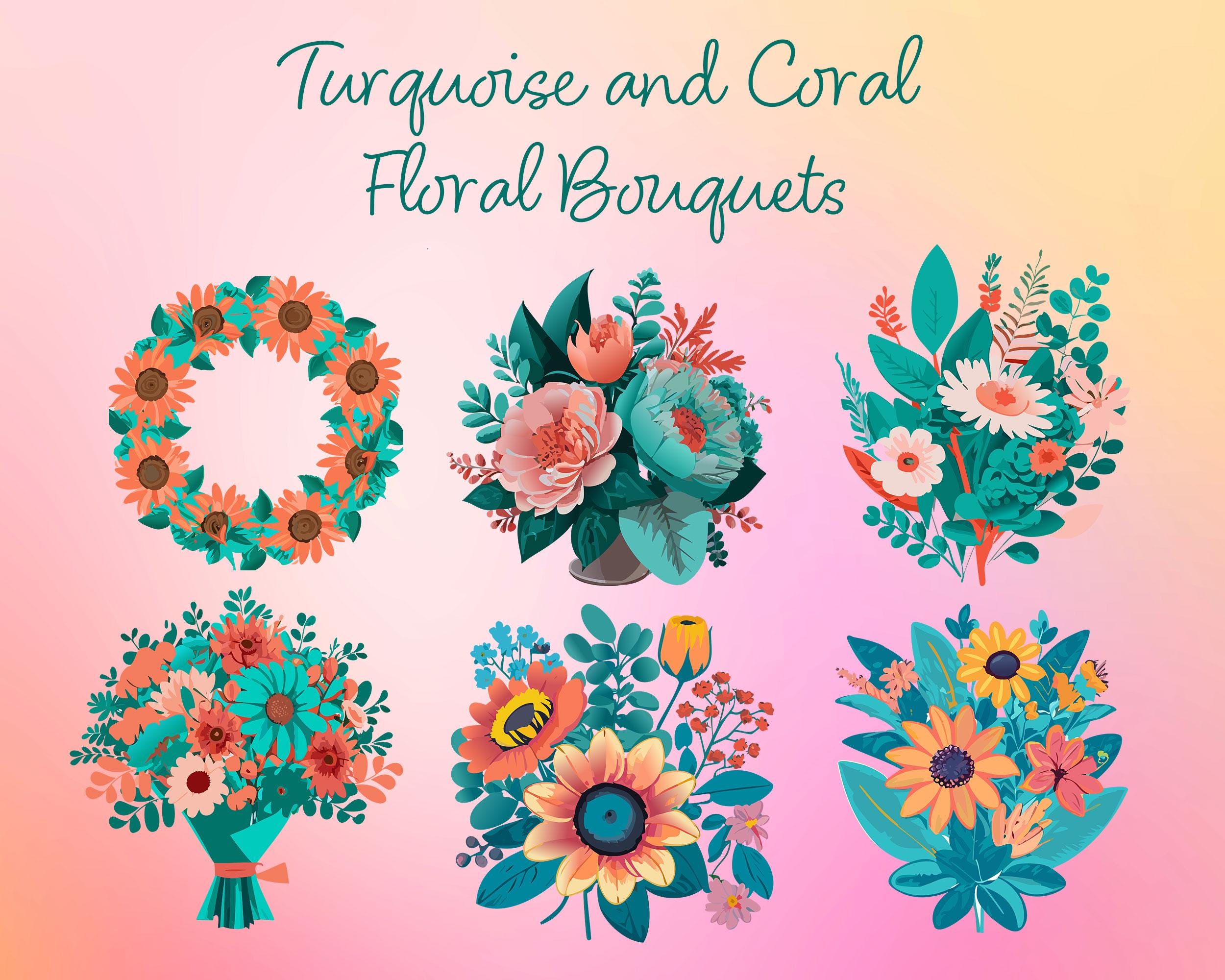 Turquoise and Coral Floral Bouquets Clipart Set | Elegant Flower PNG & SVG Bundle | Digital Download
