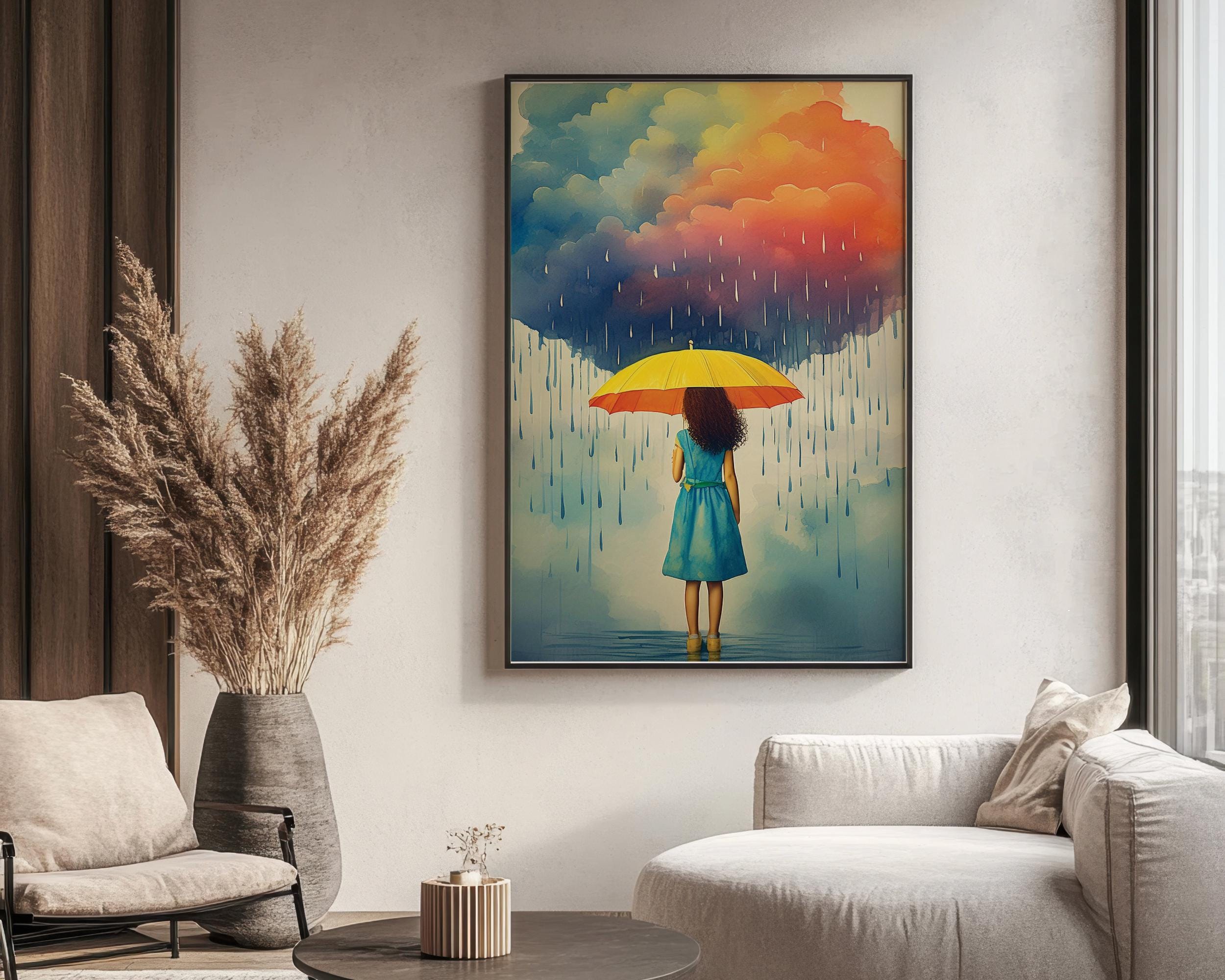 Brighten any space with this emotional and inspiring Rainbow Rain Girl Wall Art. This digital print features a young girl holding a yellow umbrella under a vibrant, rainbow-coloured cloud with soft watercolor rain. A beautiful and symbolic artwork representing hope, strength, and resilience.