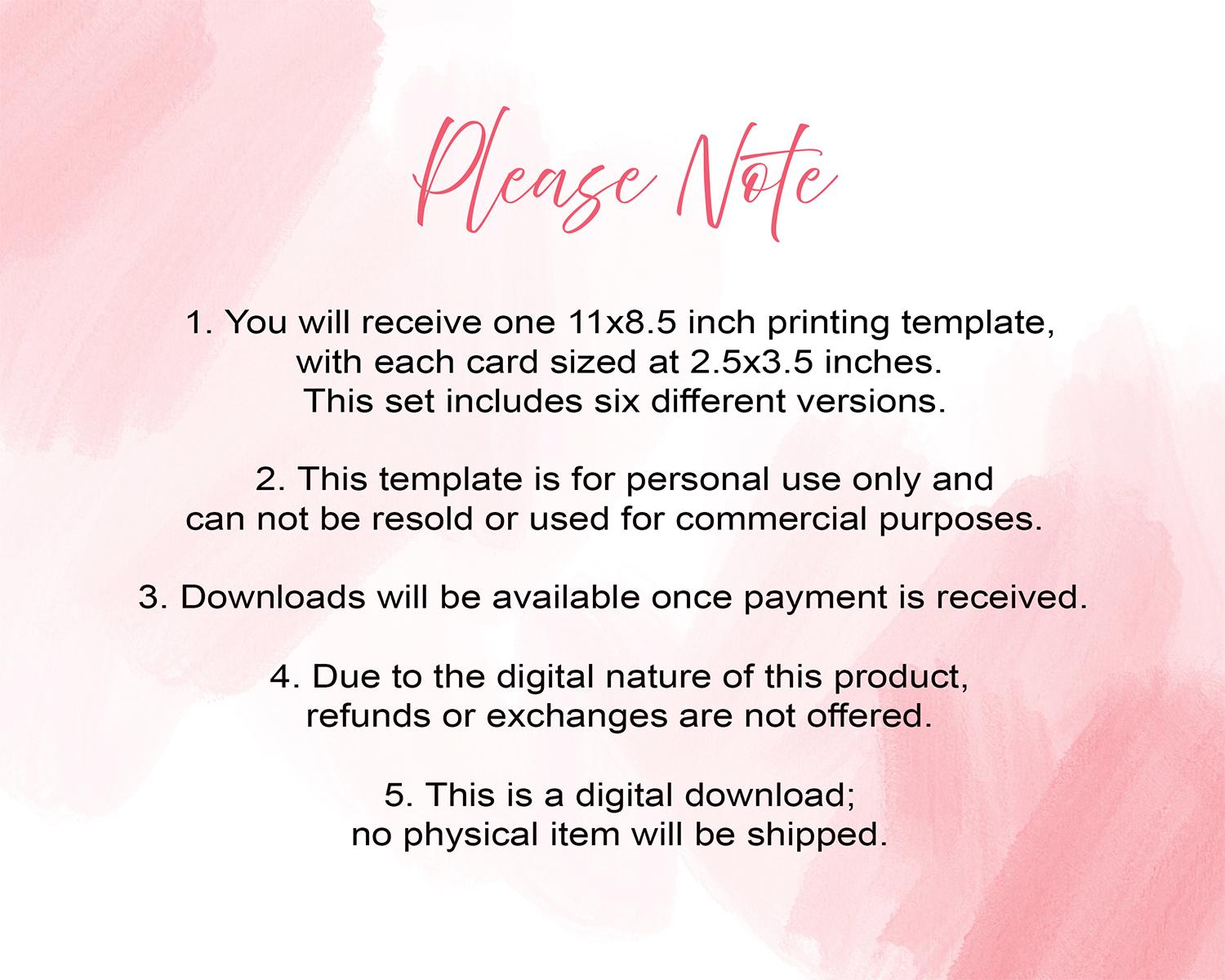 • 1 high-quality JPEG file (11x8.5 inches sheet with 6 card designs)