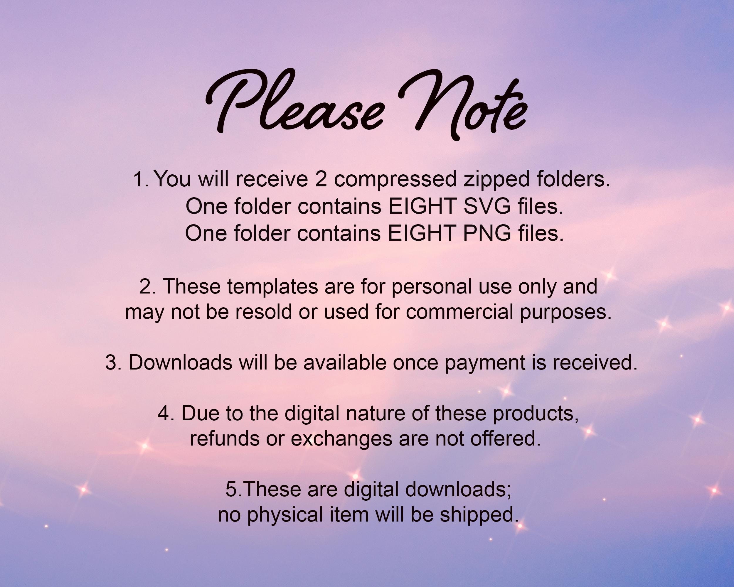 • 2 ZIP folders with 8 SVG files and 8 PNG files (transparent background)