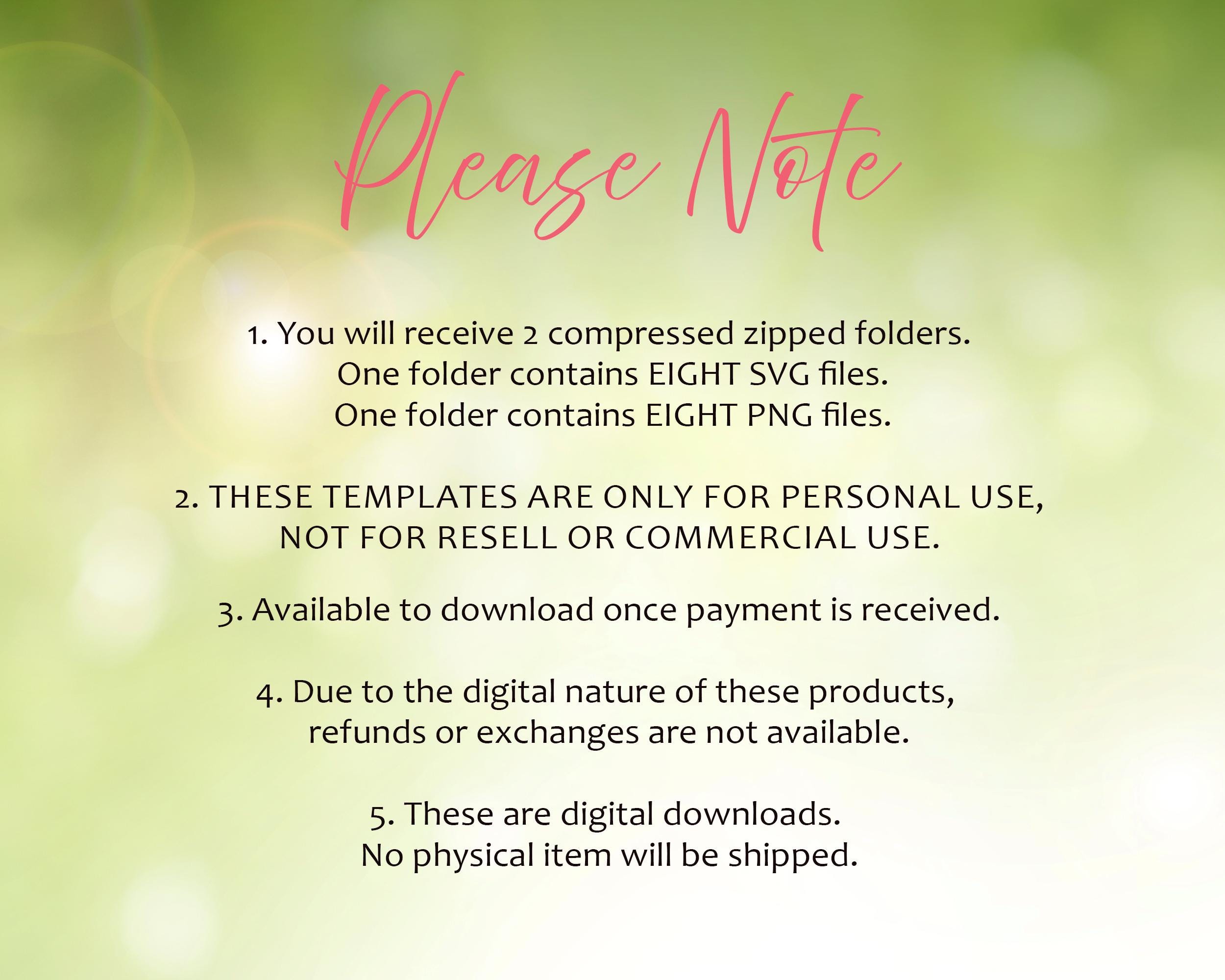 • 2 ZIP folders with 8 SVG files and 8 PNG files (transparent background)