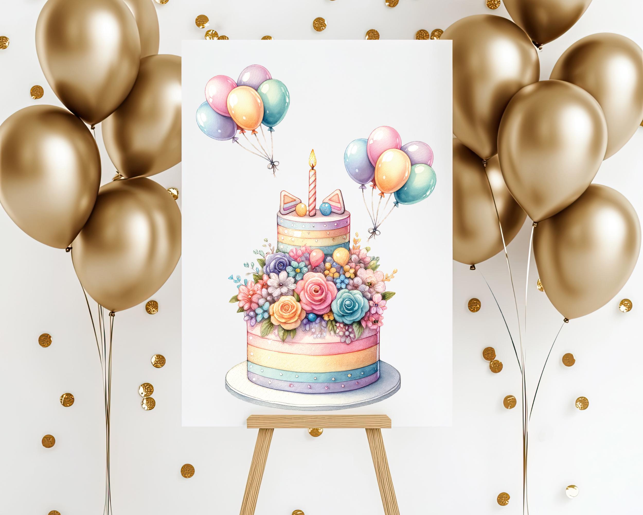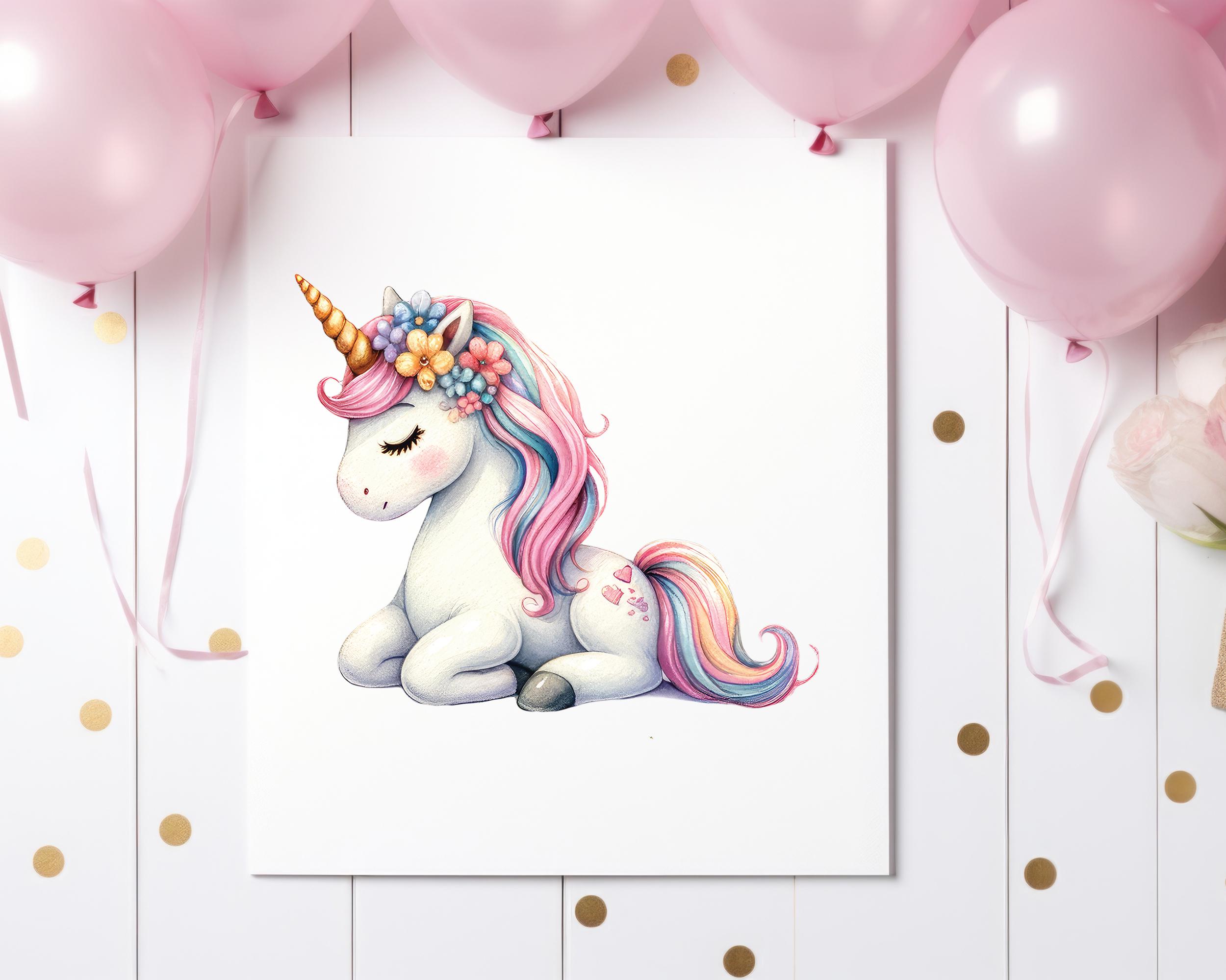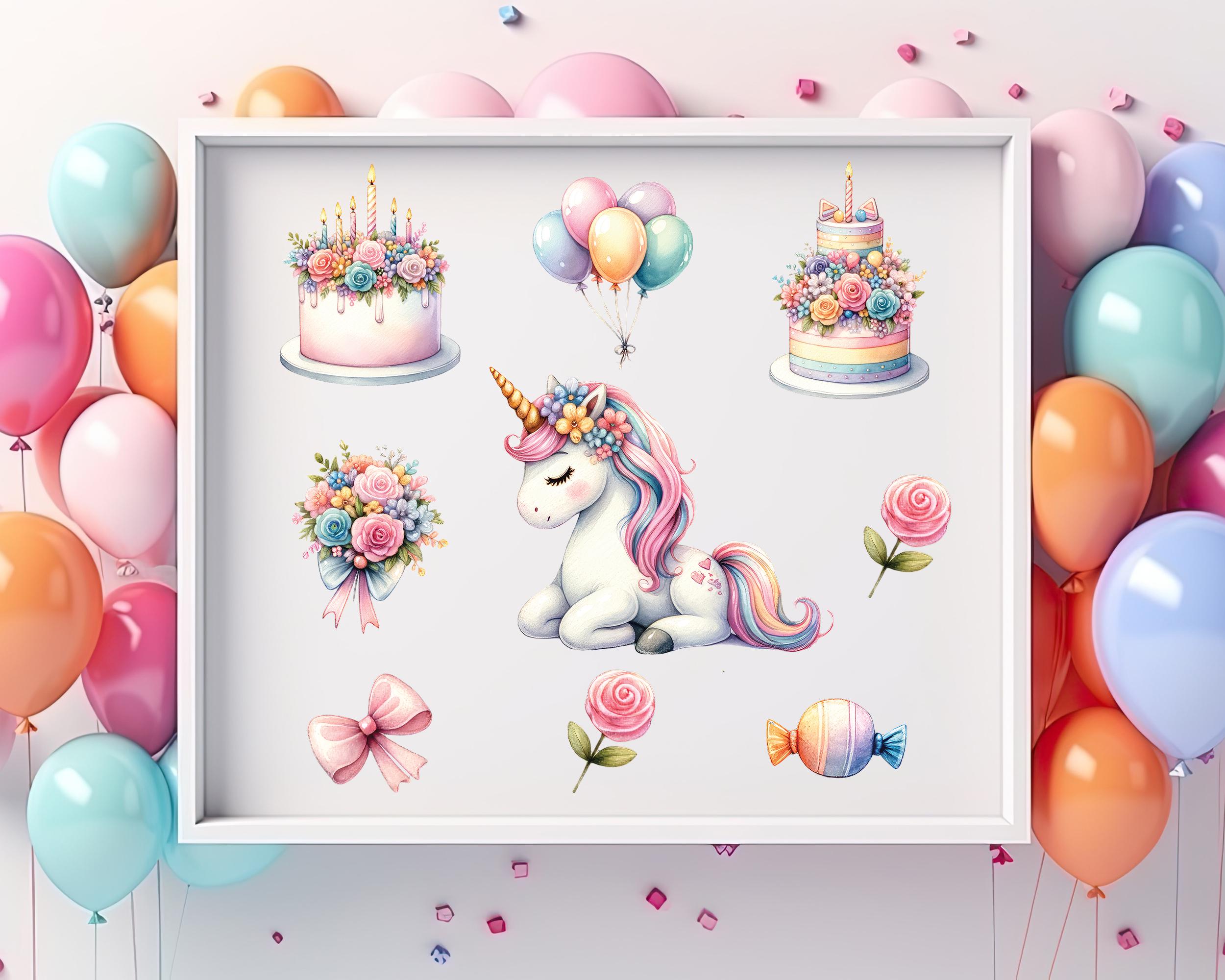 This digital set includes a charming unicorn character along with coordinating birthday cakes, balloons, florals, bows, and candy elements. Designed in a gentle pastel palette, these graphics are ideal for birthday invitations, party decorations, stickers, scrapbooking, and Cricut or Silhouette projects.