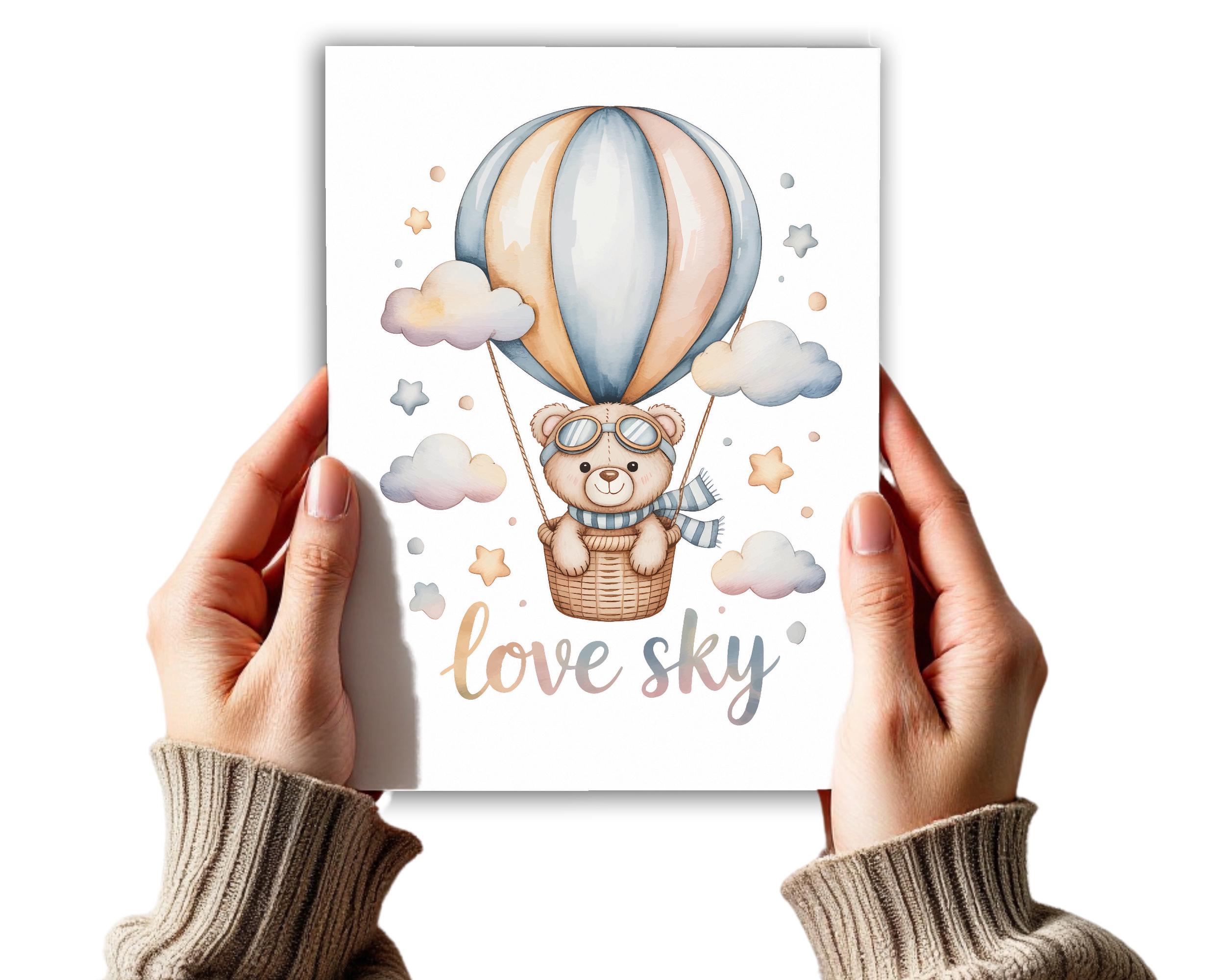 Create a dreamy and cozy space with this watercolor flying teddy bear illustration, featuring a sweet teddy bear floating in a hot air balloon among clouds and stars. This gentle, whimsical artwork is perfect for nurseries, baby rooms, kids bedrooms, and playrooms.