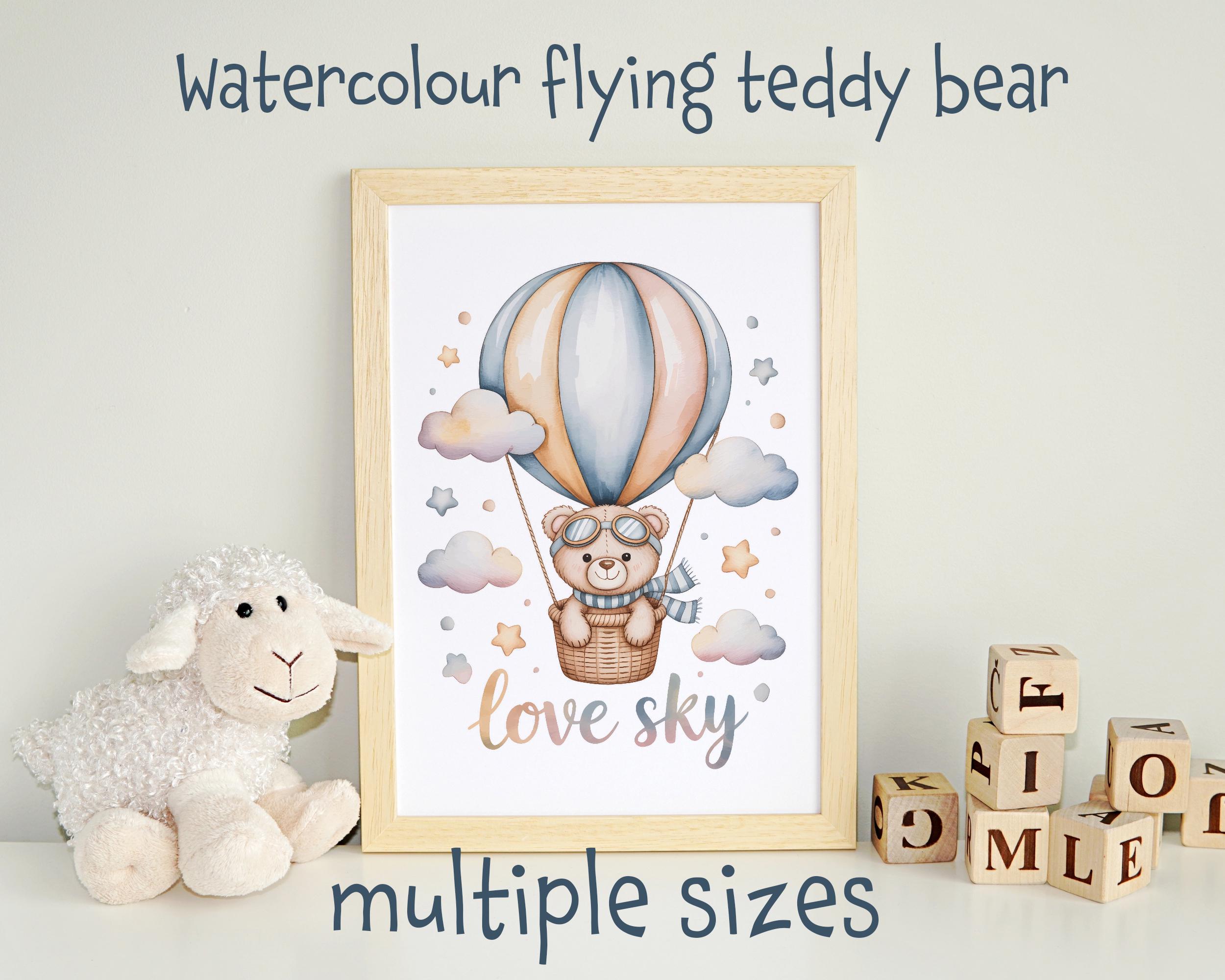 Watercolour Flying Teddy Bear Wall Art | Nursery Animal Art | Baby Room Decor Digital Download