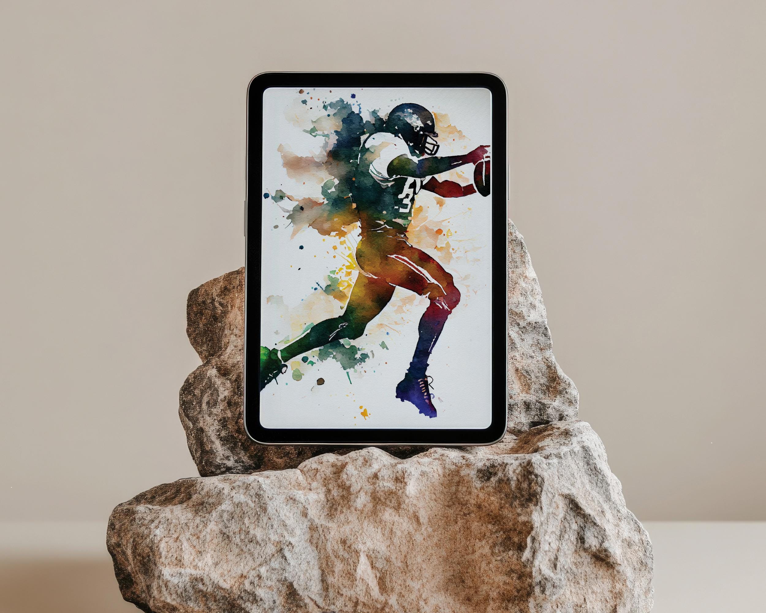 Score big with this American football player wall art, featuring a dynamic artistic illustration of a football player in motion. Designed with a bold color splash and fluid style, this sports artwork is perfect for game rooms, man caves, living rooms, kids’ rooms, gyms, and sports fan spaces.