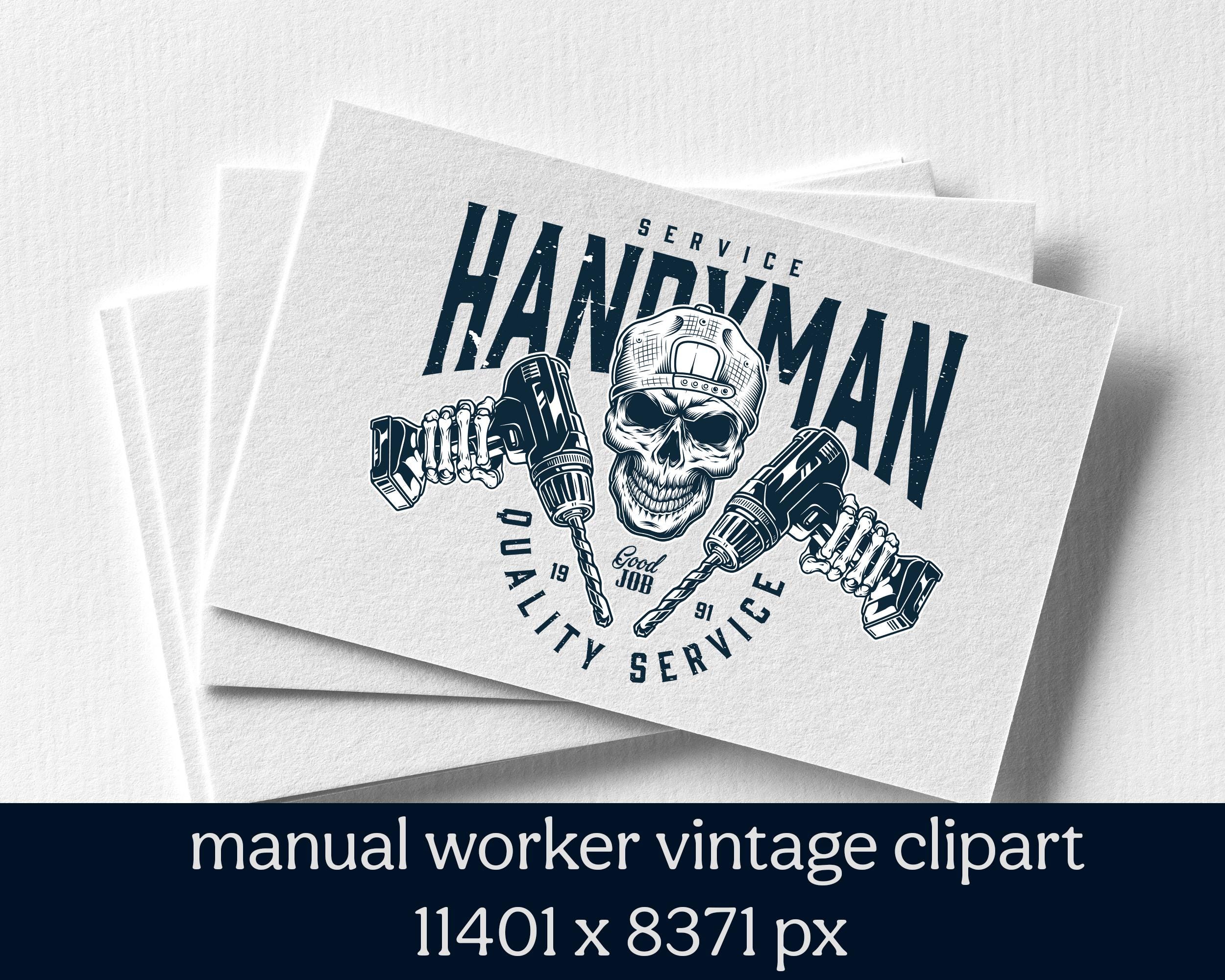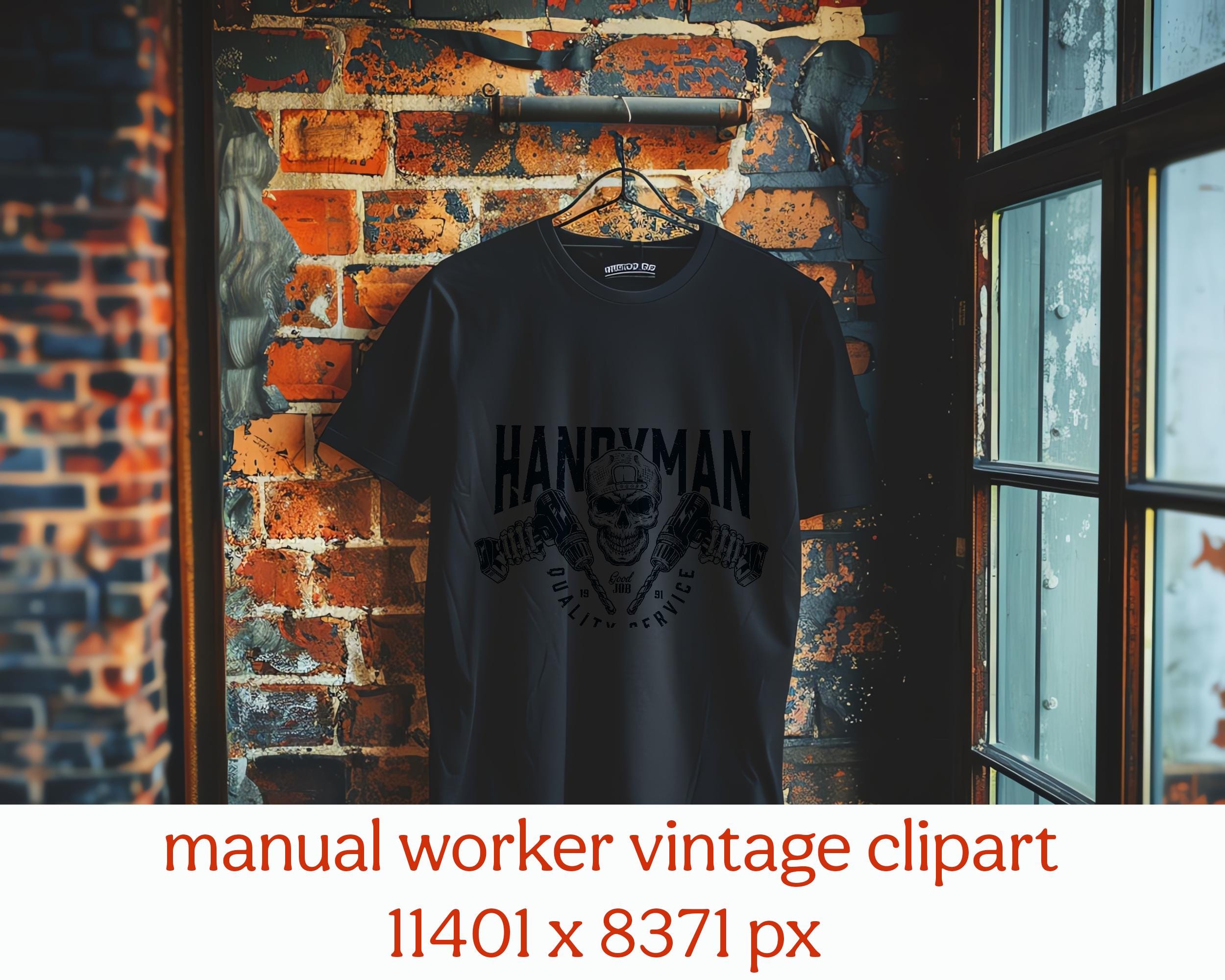 This manual worker vintage clipart features a bold retro skull design inspired by craftsmanship, hard work, and industrial style. Perfect for t-shirts, apparel, posters, stickers, mugs, signs, and print-on-demand products.